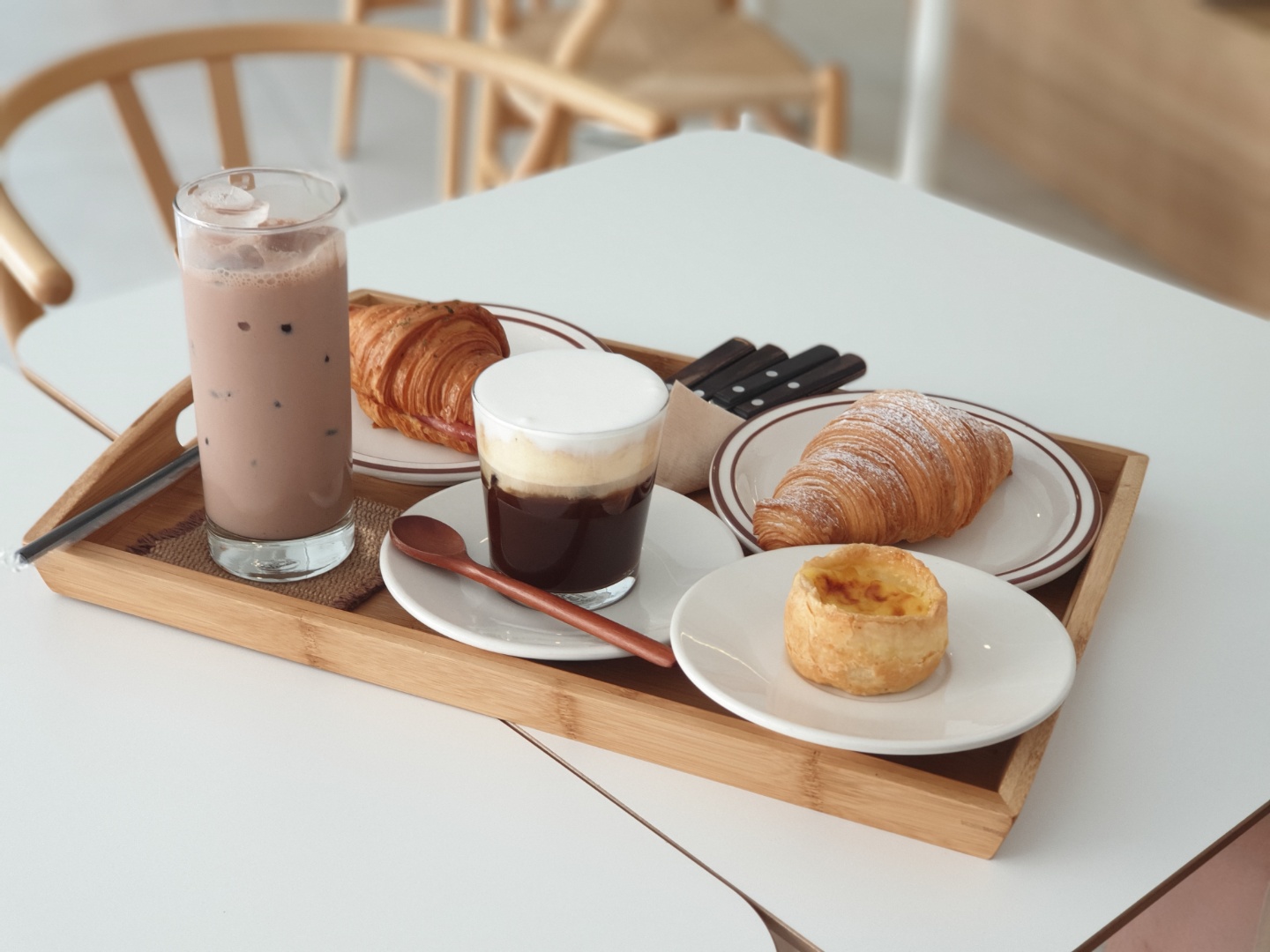 그렇게 악세사리와 사진을 찍으며 구경하면서 나열된 빵들 중 크림크로아상, 햄치즈크로아상, 에그타르트를 골랐고 음료는 초코라떼랑 아인슈페너를 시켰어요!