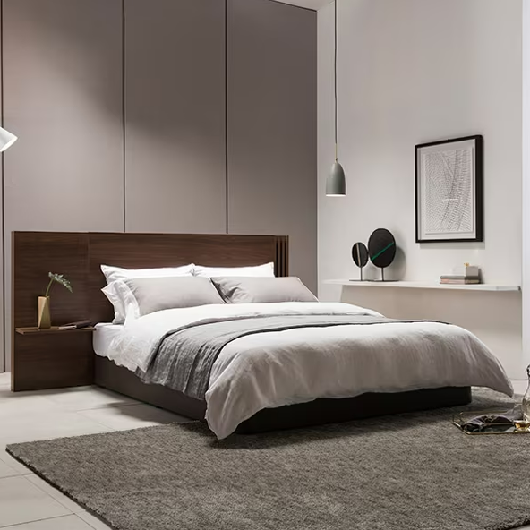 첫 번째 제품은 '코펜하겐 침대'예요. 호텔 침대처럼 고급스러운 디자인에 USB 포트와 무드등이 들어 있어요. 정말 편리하게 방을 꾸밀 수 있죠. 두 번째는 '에세이 침대'입니다. 송중기 침대로 유명한 이 제품은 깔끔한 오크 색상의 빗살 무늬가 특징이에요. 셋째, '아인슈페너 침대'인데, 가죽으로 만든 침대로 푹신한 잠자리를 보장해요. 넷째는 '레브 침대'입니다. 가성비 좋고 단순하지만 깔끔한 디자인이 매력적이에요. 마지막으로 '휴 침대'예요. 심플하면서도 고급스러운 나무 무늬결이 돋보이는 디자인이에요.